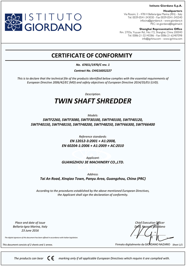 3E SWTF Film Shredder is not only won the EU CE certification, but also won the national patent for design, that is the major & sharp series! 3E SWTF Film Shredder obtain the country patent, and has passed the EU CE certification. The product adopt double film shafts design that roatate a medium speed, low noise and high efficient without pusher. Aiming at different material, it could use different shafts. Adopt Siemens programming control system, with function of start, stop, automatic reverse sensors to protect the machine against over loading and jamming. It is especially suitable for recycling the medium hardness and soft material, for example film, woven bag, jumbo bag, paper and etc.